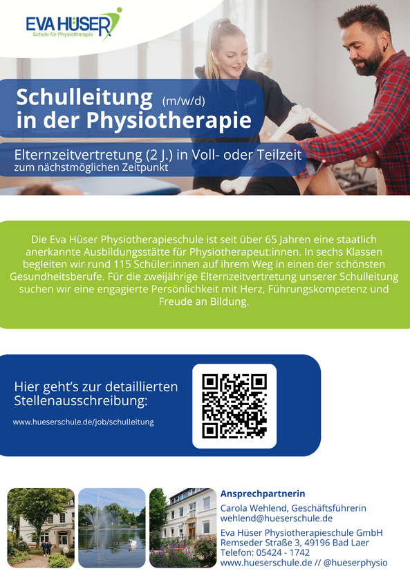 Die Eva Hüser Physiotherapieschule ist seit über 65 Jahren eine staatlich anerkannte Ausbildungsstätte für Physiotherapeut:innen. In sechs Klassen begleiten wir rund 115 Schüler:innen auf ihrem Weg in einen der schönsten Gesundheitsberufe. Für die zweijährige Elternzeitvertretung unserer Schulleitung suchen wir zum nächstmöglichen Zeitpunkt eine engagierte Persönlichkeit mit Herz, Führungskompetenz und Freude an Bildung.