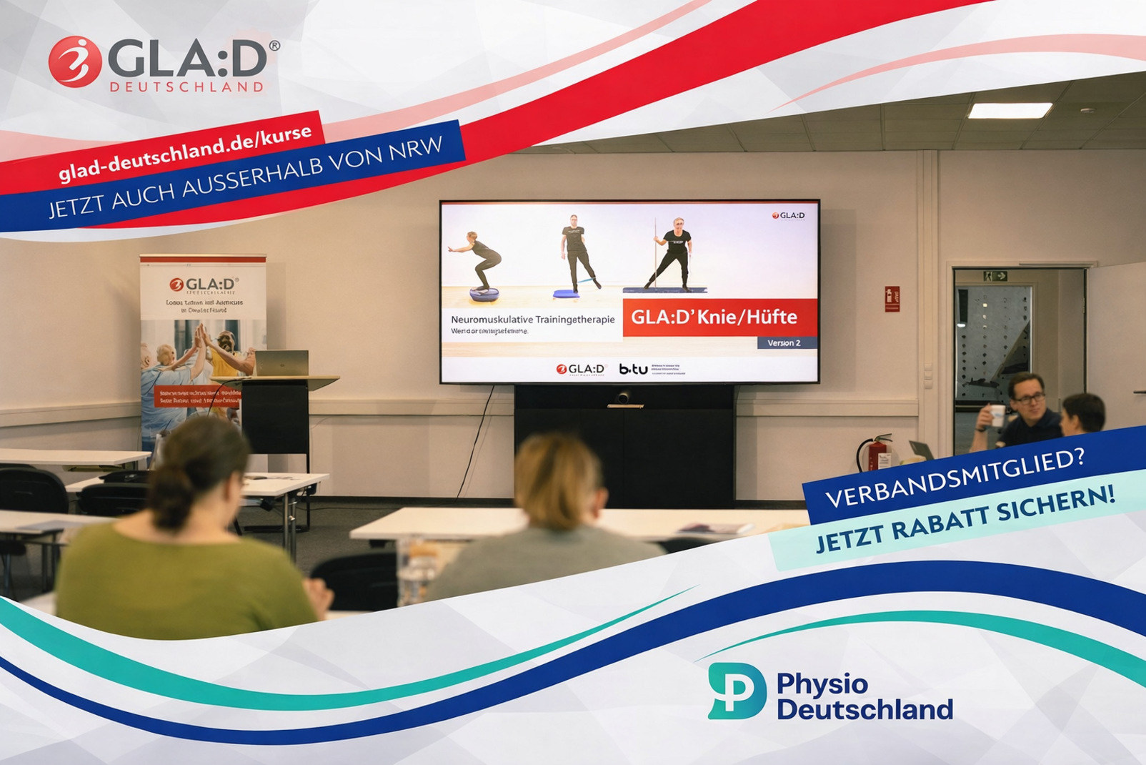 In Kooperation mit Physio Deutschland finden 2026 Therapeut*innen-Schulungen auch außerhalb von Essen statt – nämlich im März in Ulm und im Mai in München. Weitere in der zweiten Jahreshälfte sind bereits in Planung. Mitglieder von Physio Deutschland können vergünstigt die GLA:D-Schulung besuchen. Den Rabattcode finden Mitglieder nach dem Login hier.