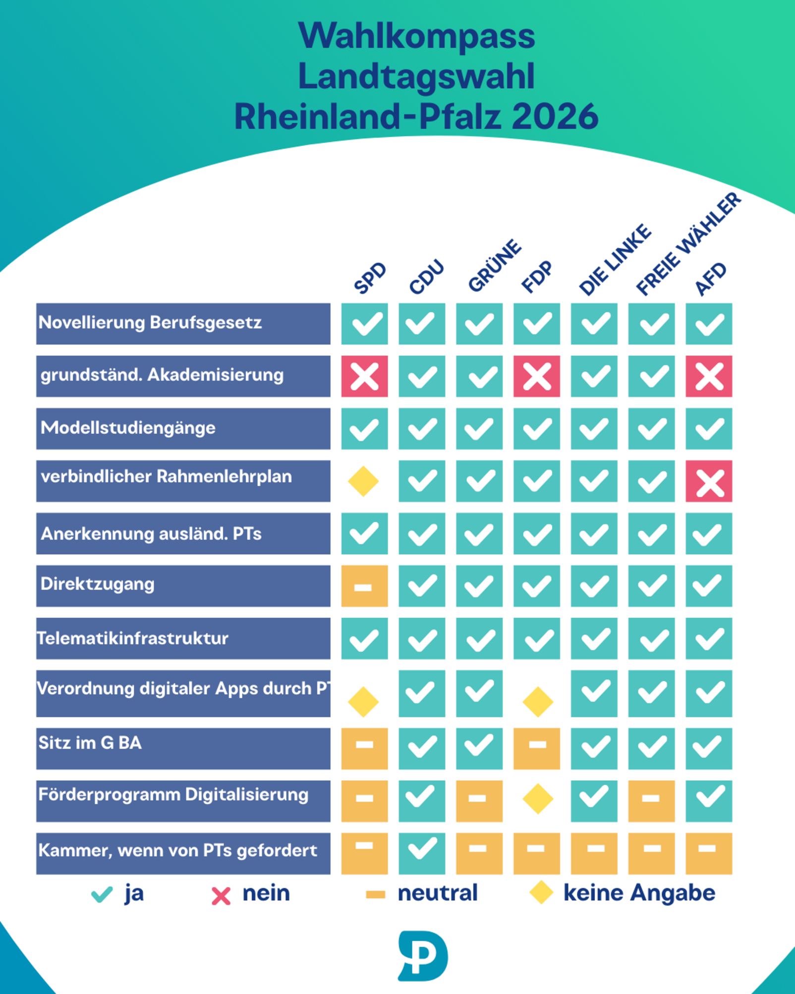 Vor 4 Wochen hatten wir als Dachorganisation der Heilmittelverbände RLP (DOH RLP) die Parteien mit einem Fragenkatalog gebeten, unsere wichtigsten Themen im Heilmittelbereich zu beantworten und die Schwerpunkte für die nächste Legislatur im physiotherapeutischen Bereich herauszuarbeiten.