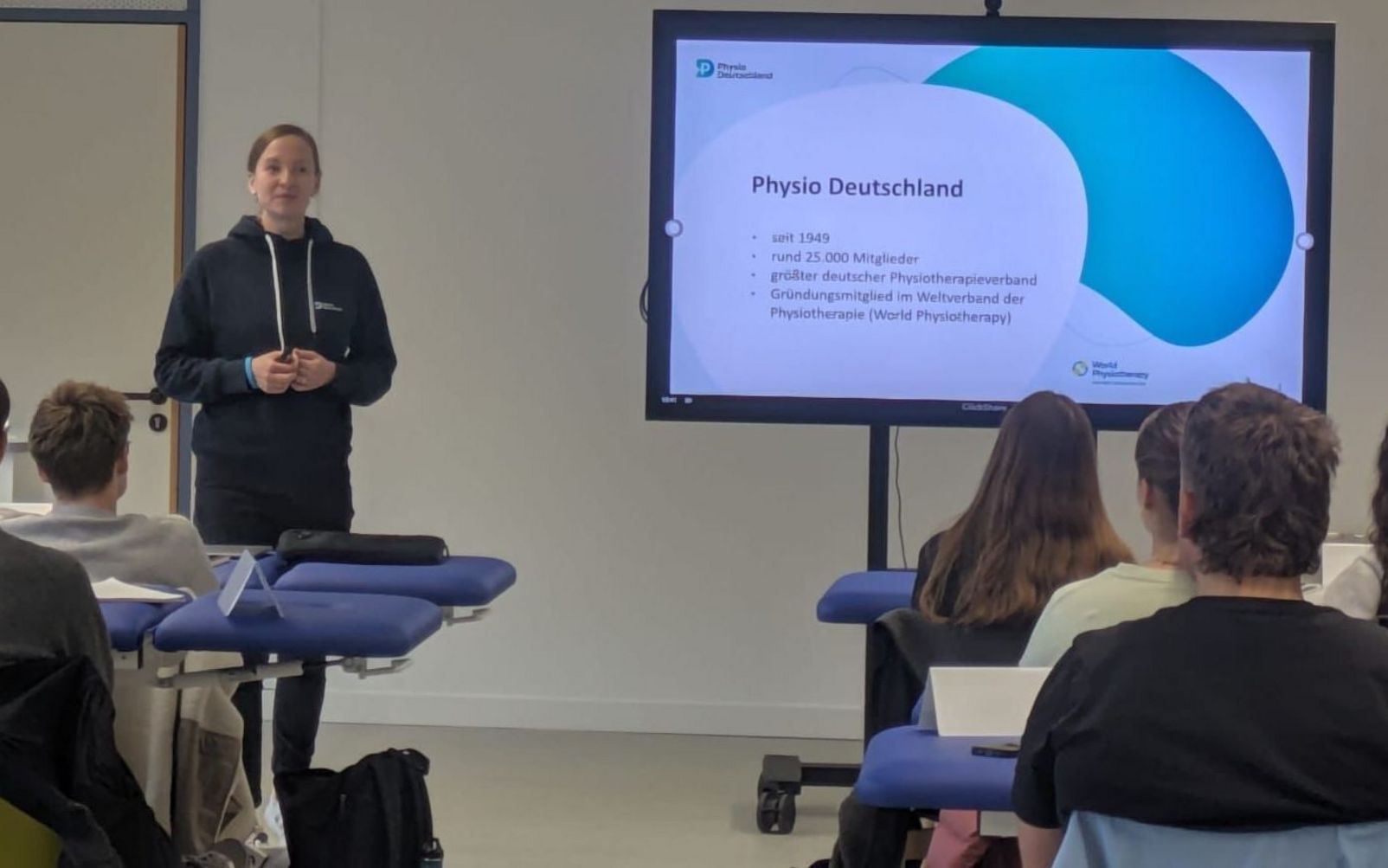 Hannah Hecker stellte den Studierenden die Arbeit des Verbands und aktuelle berufspolitische Themen vor. „Es lässt sich hier wunderbar durch den neugeschaffenen Studiengang zeigen, wie Verbandsarbeit wirkt und wie berufspolitische Arbeit erfolgreich sein kann“, berichtete Hecker. „Vielen Dank für den tollen Austausch.“